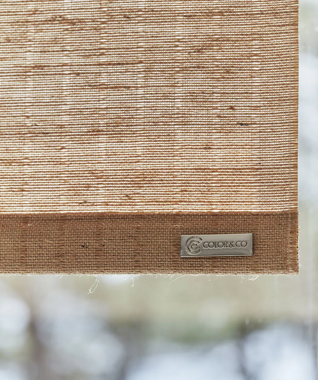 Rullegardin – brunt plante med kjedetrekk. Denne vakre og helt unike gardinen er vevd i et fint mønster av garn fra stilken til juteplanten samt fine hvite tråder. Når gardinen rulles ut er mønsteret nesten usynlig, men blir mer synlig avhengig av lysstrømmen.Gardinen gir et vakkert og naturlig uttrykk til hjemmet, og skaper det fineste lyset når solens stråler treffer gardinen. Finnes også med snortrekk.